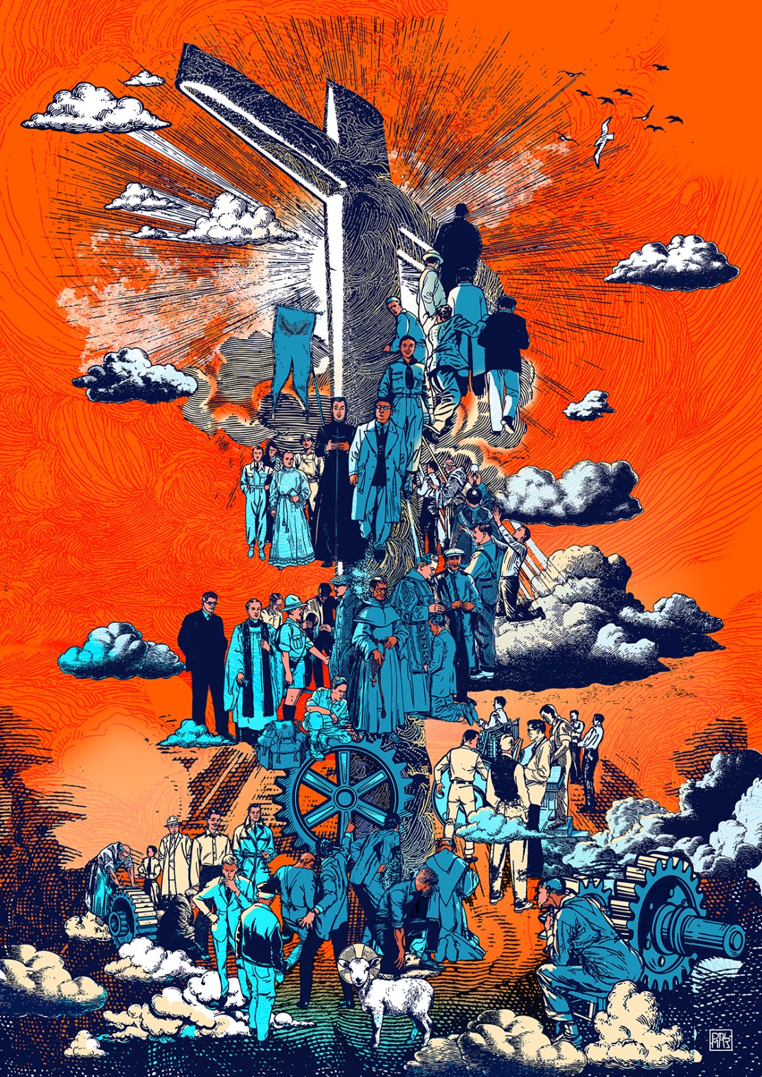 Dans l’œuvre de Nicolas de Palmaert, cet orange lumineux devient ainsi la couleur du passage : passage de la nuit à l’aube, de la terre au ciel, de l’épreuve à la béatitude. C’est dans cette lumière que s’inscrit la montée des 50 martyrs, désormais bienheureux, vers la joie de Dieu.